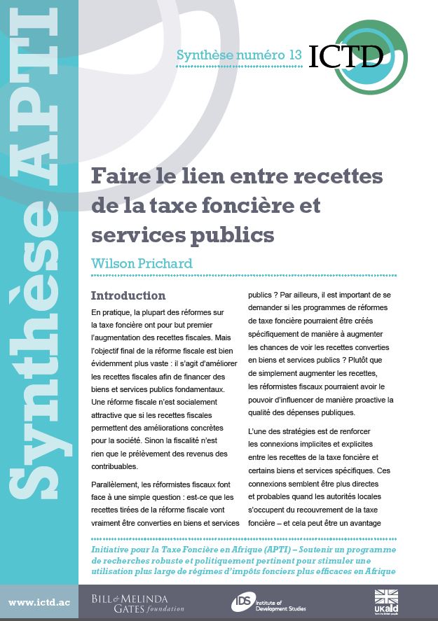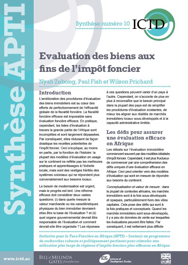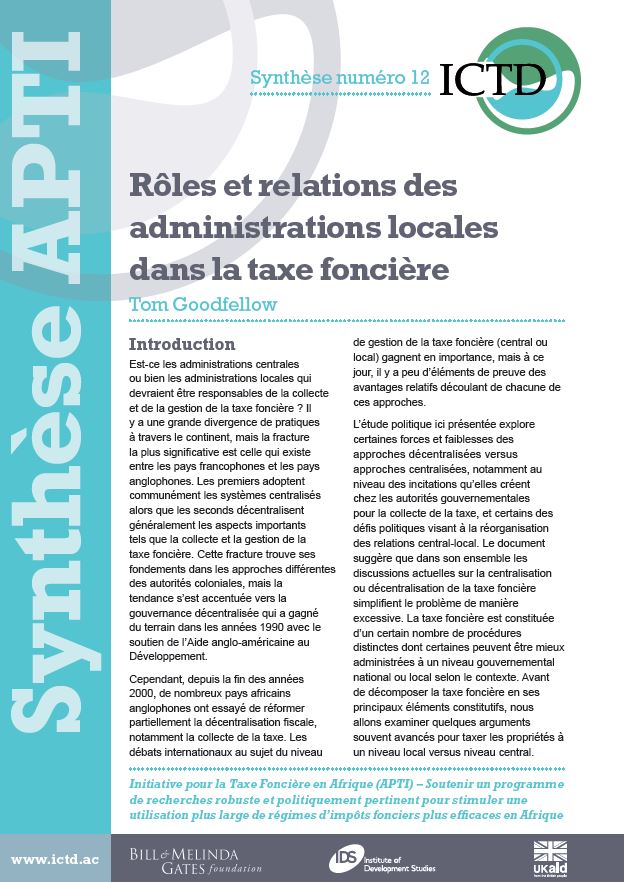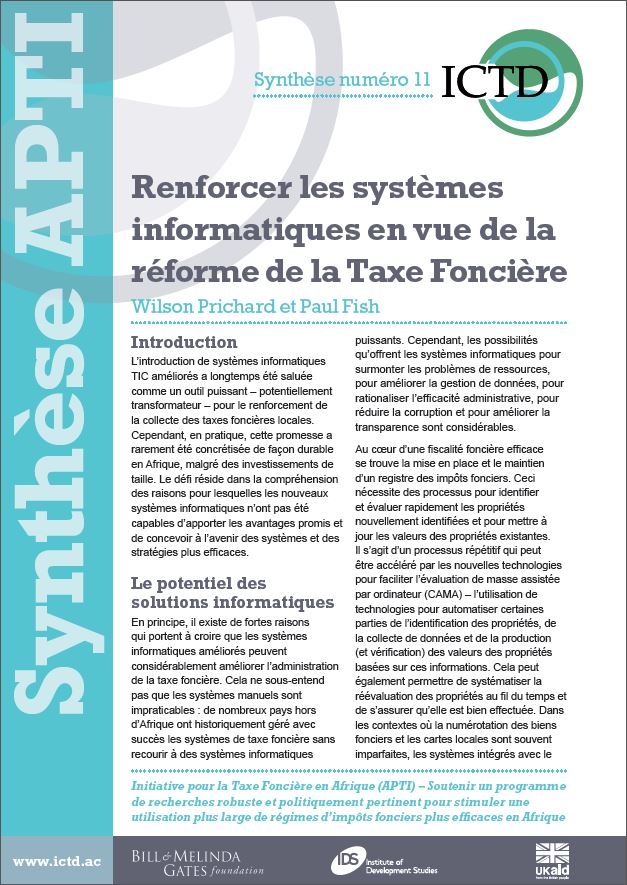 Bien que l’imposition foncière soit largement reconnue comme l’une des meilleures formes de fiscalité assurant l’équité, la croissance économique et un financement stable aux collectivités locales, elle est sous-utilisée dans de nombreuses parties du monde et notamment en Afrique. Cette situation a créé un besoin réel d’améliorer les politiques et cadres de mise en œuvre de la fiscalité foncière. Avec le financement de la Fondation Bill et Melinda Gates, le Centre International pour la Fiscalité et le Développement (ICTD) est heureux de présenter l’Initiative pour la taxe foncière en Afrique (APTI).