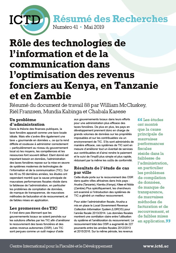 Dans la théorie des finances publiques, la taxe foncière apparait comme une taxe locale idéale. Mais elle s’avère être également une taxe « gourmande en données », ce qui la rend difficile et couteuse à administrer correctement – particulièrement au niveau du gouvernement local où les moyens, les compétences et les ressources font souvent défaut. Etant donné cet important besoin en données, l’administration des taxes foncières repose sur la mise en œuvre de systèmes modernes de technologies de l’information et de la communication (TIC). Sur les 40 ou 50 dernières années, les études ont cependant montré que la cause principale de mauvaises performances fiscales réside dans la faiblesse de l’administration, en particulier les problèmes de compilation de données, de manque de transparence, de mauvaises méthodes de facturation et de recouvrement, et de faibles mises en application. Résumé du document de travail 88 par William McCluskey, Riël Franzsen, Mundia Kabinga et Chabala Kasese.