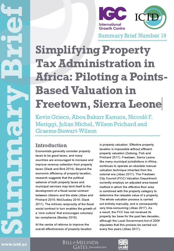 The current method of property valuation in Freetown, Sierra Leone is highly inaccurate and generally regressive, as it does not take subjective property characteristics that are major determinants of value into account. The newly elected Mayor Yvonne Aki-Sawyerr made revenue mobilisation a central pillar of her ‘Transform Freetown’ agenda. As a means of achieving this, the Mayor and her advisers began to reach out internationally for reform advice. This brief outlines a pilot project carried out jointly by the IGC and ICTD for a new approach to property valuation in Freetown using a points-based valuation methodology in the Freetown context. The project had six key findings, including that high-level political leadership was a major enabler of the project’s success. The authors outline 6 policy considerations for future scale-ups of the research and for reforming property tax in Freetown.