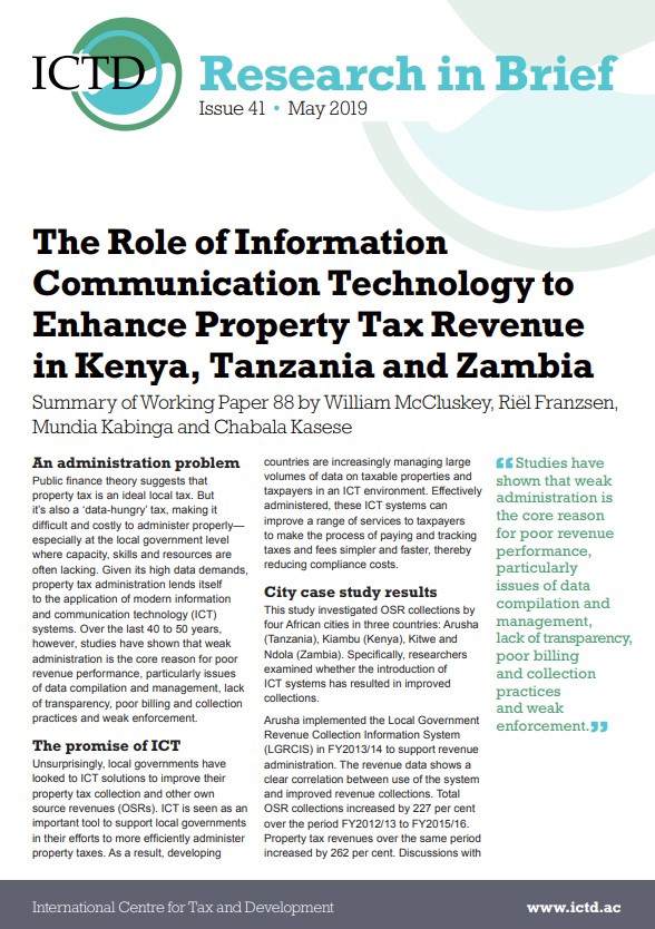 Public finance theory suggests that property tax is an ideal local tax. But it’s also a ‘data-hungry’ tax, making it difficult and costly to administer properly— especially at the local government level where capacity, skills and resources are often lacking. Given its high data demands, property tax administration lends itself to the application of modern information and communication technology (ICT) systems. Over the last 40 to 50 years, however, studies have shown that weak administration is the core reason for poor revenue performance, particularly issues of data compilation and management, lack of transparency, poor billing and collection practices and weak enforcement. This paper is a 2-page brief summary of Working Paper 88 by William McCluskey, Riël Franzsen, Mundia Kabinga and Chabala Kasese